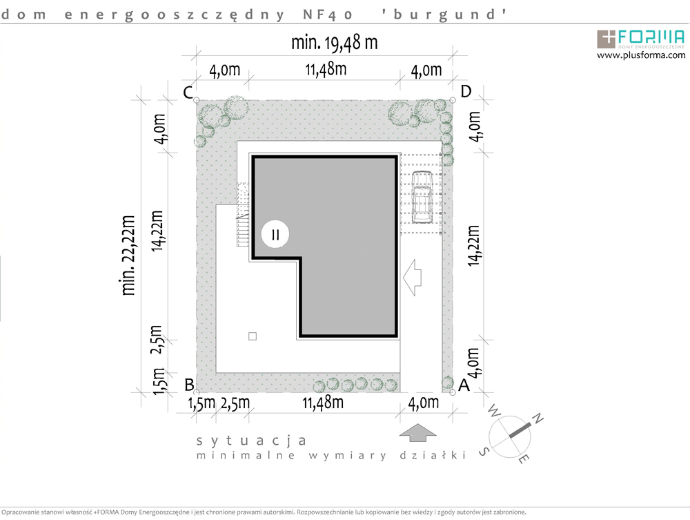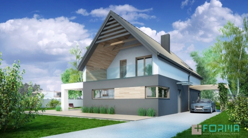 Krótka charakterystyka budynku:Trzy główne zalety: - dynamiczna forma; - główna sypialnia z osobną łazienką; - część dzienna zintegrowana z tarasem. Burgund to dom energooszczędny w nowoczesnym stylu, zaprojektowany z myślą o 4 - 5 osobowej rodzinie. Dom w standardzie NF 40, kwalifikuje sie do otrzymania dopłaty do kredytu na jego budowę. Prosty dach, zastosowanie takich elementów jak drewno czy szkło powodują, że dom jest ciekawy w odbiorze i dobrze sie komponuje z otoczeniem. Duży taras w narożu domu jest ażurowo zadaszony, co jest idealnym rozwiązaniem na letnie upały, a zarazem pozwoli unikać wiatru w chłodniejsze dni. Dla miłośników pełnego słońca zaprojektowano przestronny taras dostępny z poddasza, ale także zewnętrznymi schodami z poziomu parteru. Ciekawym rozwiązaniem funkcjonalnym jest to, że główna sypialnia wraz z własną łazienką i garderobą znajduje sie na parterze, co pozwala, w razie potrzeby, wyłączyć z użytkowania całe poddasze, minimalizując w ten sposób koszty utrzymania domu w przyszłości. Na poddaszu znajdują się dwie duże sypialnie, w tym jedna z osobnym tarasem, oraz przestronna łazienka z wanną i prysznicem.