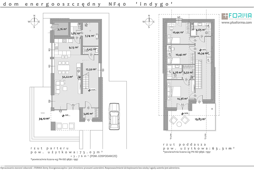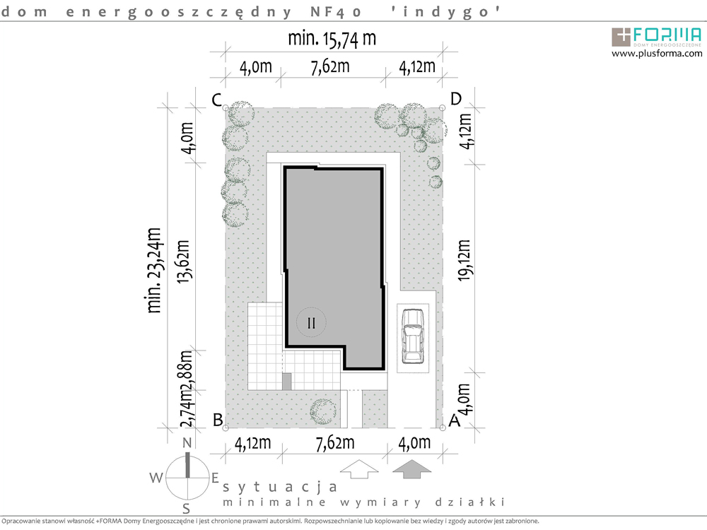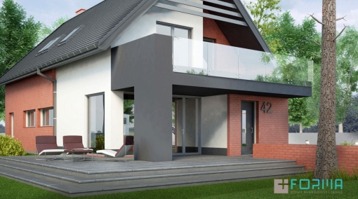 Krótka charakterystyka budynku:Trzy główne zalety: - pasuje na wąską działkę - dodatkowe pomieszczenie ogrodowe - przestronny i rodzinny 'Indygo' to dom z klasą, energooszczędny i funkcjonalny, zaprojektowany z myślą o 4 - 5 osobowej rodzinie. Dom w standardzie NF 40, kwalifikuje sie do otrzymania dopłaty do kredytu na jego budowę. Dobrana kolorystyka elewacji i zastosowanie cegły klinkierowej sprawiają, że dom nabiera eleganckiego i stylowego wyglądu. Projekt dedykowany jest posiadaczom wąskiej działki z wjazdem od południa lub wschodu. Niewątpliwą zaletą tego domu jest otwarta i przestronna strefa dzienna z kominkiem, z orientacją południowo zachodnią i bezpośrednim połączeniem z dużym trasem, częściowo zadaszonym. Przy kuchni zaprojektowano sporą spiżarnię, która połączona jest z kotłownią. Na poddaszu znajdują się dwie mniejsze sypialnie i jedna sypialnia małżeńska z osobna łazienką i garderobą. Z tej sypialni oraz holu możliwe jest wyjście na duży taras. |